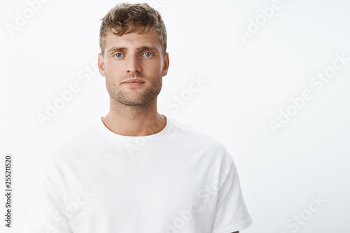 Serious-looking peaceful and calm attractive blond european man with blue eyes and bristle looking at camera focused and chill without emotions, unbothered over gray background in white t-shirt