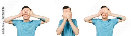 Set of portraits of young guy with closing face with hands isolated on a white background.