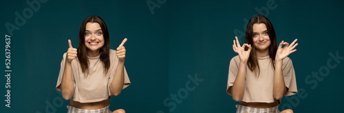 Set of two photos cheerful young happy brunette woman in a beige t-shirt showing a gestures thumb up and OK on cyan color background. Like gesture. Collage.