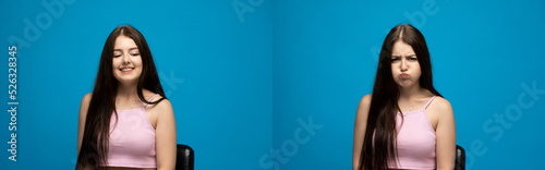 Set of two young woman's portraits with different emotions, angry, sad, happy. Beautiful brunette in a pink t-shirt on a blue background. Collage.