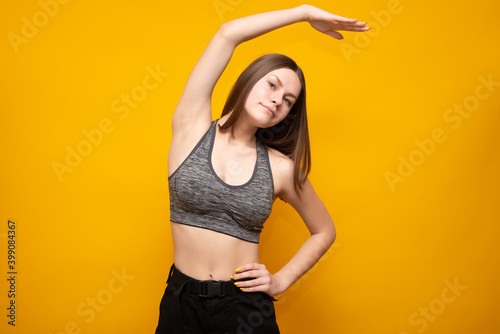Sexy Caucasian Young woman stretches and plays sports on isolated yellow background. The concept of health,pain in the back.