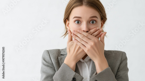 Shhh, Don't Tell: A young woman in a professional suit, her expression of shock and surprise conveyed by her hands covering her mouth, embodies a powerful nonverbal communication of secrecy, intrigue.