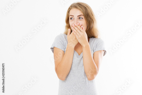 Shhh sign. Young woman showing shh gesture to keep a silent. Girl in t shirt keep a secret. Quiet place and silence time. Copy space
