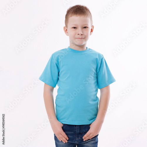 Shirt design and people concept - close up of young man in blank blue tshirt front and rear isolated. Mock up template for design print