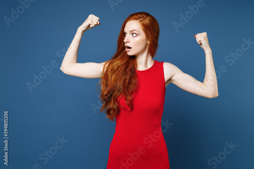 Shocked amazed young redhead woman 20s wearing bright red elegant evening dress standing spreading hands showing biceps muscles looking aside isolated on blue color wall background studio portrait.