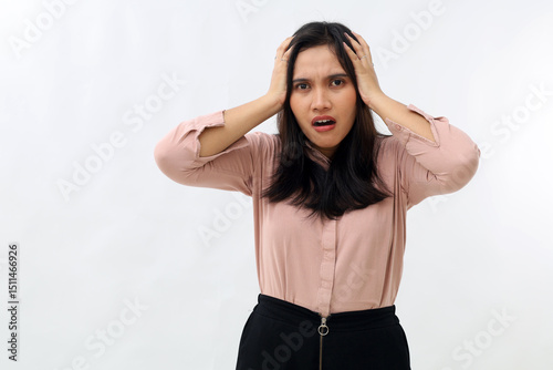 Shocked and anxious young Asian woman in panic, holding hands on head and worried, looking at camera, standing frustrated and afraid on white background.