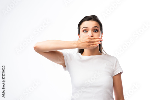 shocked and brunette woman in white t-shirt covering mouth isolated on white