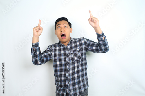 shocked asian man pointing finger with scared face isolated on white wearing casual shirt