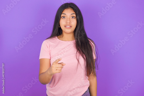 Shocked Hispanic brunette girl wearing pink t-shirt over purple background points at you with stunned expression
