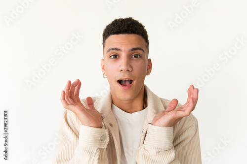 Shocked man looking at camera. Portrait of handsome surprised young man gesturing with hands and looking at camera on grey background. Emotion concept