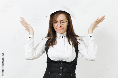 Shocked perplexed caucasian young brown-hair business woman in black suit white shirt glasses with work documents on head isolated on white background. Manager or worker. Copy space for advertisement.