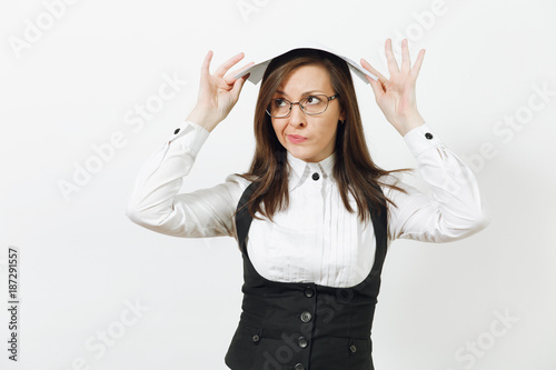 Shocked perplexed caucasian young brown-hair business woman in black suit white shirt glasses with work documents on head isolated on white background. Manager or worker. Copy space for advertisement.