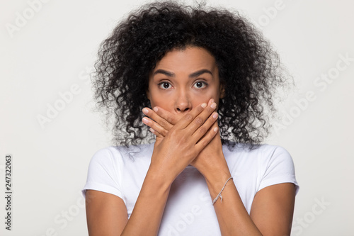 Shocked scared african woman with surprised face covering mouth with hands isolated on white grey studio background, stunned mute black lady looking at camera feels horrified keeping secret, portrait