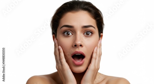 Shocked woman holding her face, isolated on white, showcasing raw emotion in high-key studio lighting. Her expression is unforgettable.