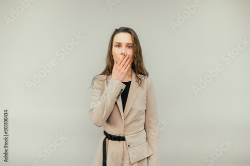 Shocked woman in a suit stands on a beige background and covers her face with her hand and looks at the camera with a surprised face.