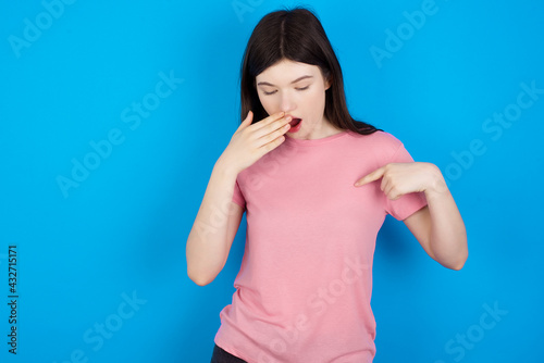 Shocked young beautiful Caucasian woman wearing pink T-shirt over blue wall look surprisedly down, indicates at blank with fore finger, Scared model