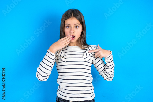 Shocked Young beautiful teen girl wearing striped T-shirt look surprisedly down, indicates at blank with fore finger, Scared model