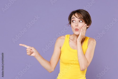 Shocked young brunette woman girl in yellow casual tank top posing isolated on pastel violet background. People lifestyle concept. Mock up copy space. Pointing index finger aside, put hand on cheek.