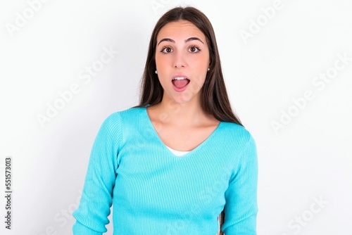 Shocked Young caucasian woman wearing blue sweater over white background stares bugged eyes keeps mouth opened has surprised expression. Omg concept