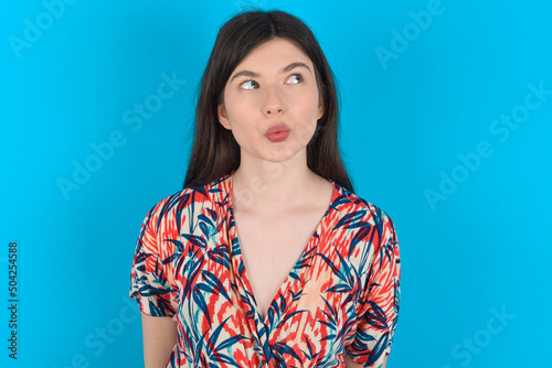 Shocked young caucasian woman wearing floral dress over blue background look empty space with open mouth screaming: Oh My God! I can't believe this.