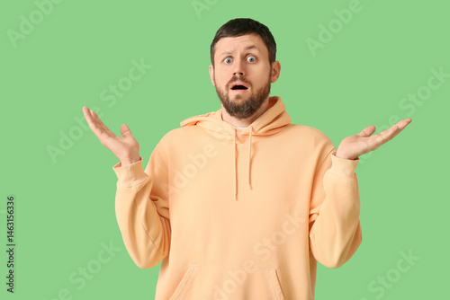 Shocked young man on green background