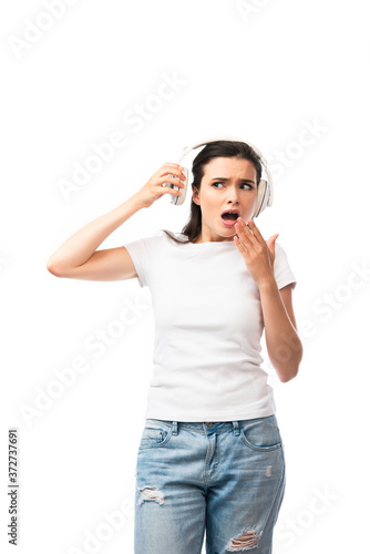 shocked young woman in white t-shirt touching wireless headphones isolated on white