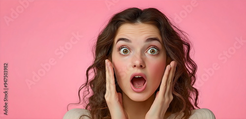 Shocked young woman with wavy hair and hands on cheeks against pink background. Extreme surprise and emotional expression
