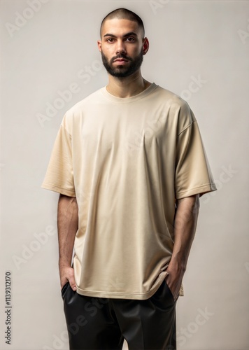 short hair male beard model blank beige oversize t-shirt mock up white label clean background
