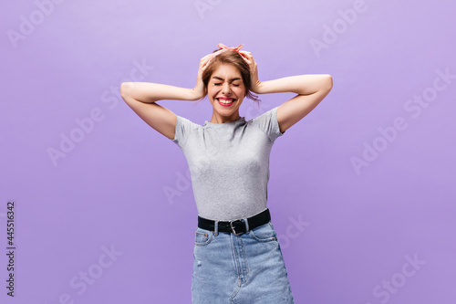 Shot of Lady in denim skirt on purple background. Joyful charming woman in grey trendy shirt has fan on isolated background..