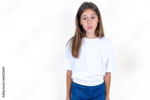 Shot of pleasant looking Beautiful little kid girl wearing white T-shirt , pouts lips, looks at camera, Human facial expressions