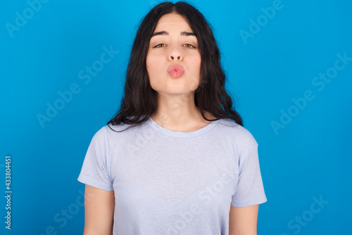 Shot of pleasant looking young beautiful tattooed girl wearing blue t-shirt standing against blue background, pouts lips, looks at camera, Human facial expressions