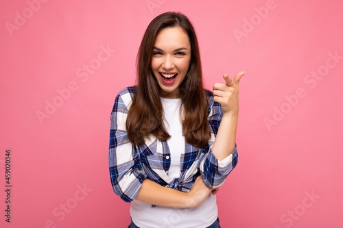 Shot of young happy smiling beautiful brunette woman with sincere emotions wearing trendy check shirt isolated on pink background with empty space
