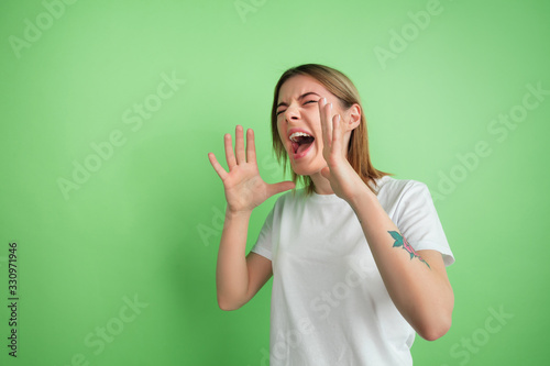 Shouting, screaming. Caucasian young woman's portrait isolated on green studio background. Beautiful female model in white shirt. Concept of human emotions, facial expression, sales, ad, youth.
