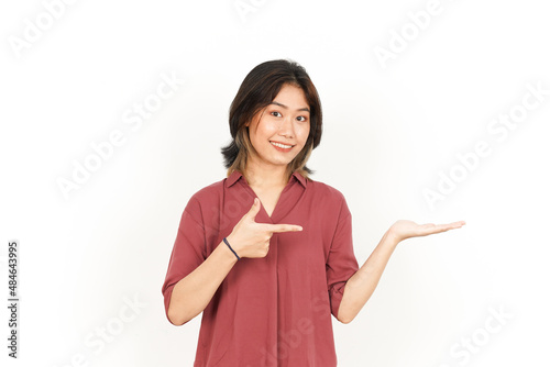 Showing and Presenting Product on Open Palm Of Beautiful Asian Woman Isolated On White Background