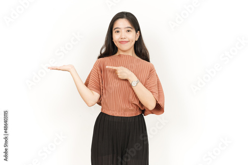 Showing and Presenting Product on Open Palm Of Beautiful Asian Woman Isolated On White Background