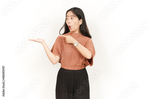 Showing and Presenting Product on Open Palm Of Beautiful Asian Woman Isolated On White Background