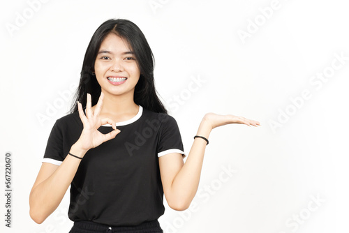 Showing and Presenting Product on Open Palm with ok sign Of Beautiful Asian Woman Isolated On White