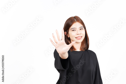 Showing Five count finger of Beautiful Asian Woman Isolated On White Background