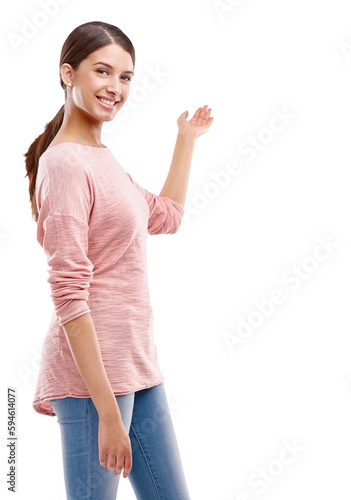 Showing, happy and portrait of woman for choice on isolated, png and transparent background. Advertising, happiness and female smile with hand sign for branding, promotion and presenting gesture