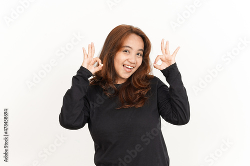 Showing OK Sign Of Beautiful Asian Woman Wearing Black Shirt Isolated On White Background