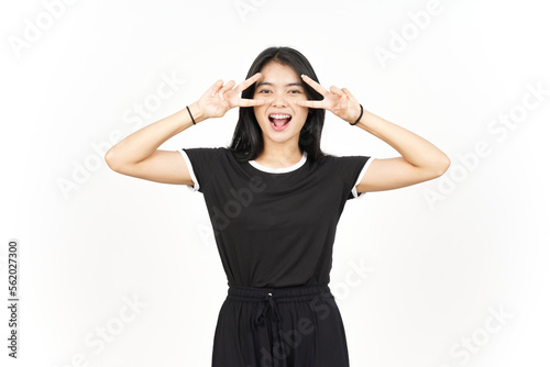 Showing Peace Sign on Eye Of Beautiful Asian Woman Isolated On White Background