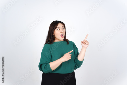 Showing Product and Pointing Side at copy space Of Beautiful Asian Woman wearing green Isolated On White Background