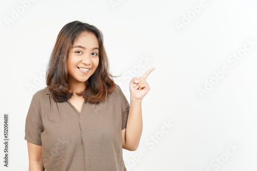 Showing Product and Pointing Side of Beautiful Asian Woman Isolated On White Background