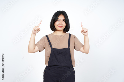 Showing Product and Pointing Up of Beautiful Asian Woman Isolated On White Background