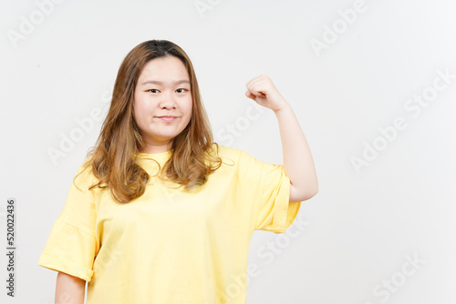 Showing Strength Arms of Beautiful Asian Woman wearing yellow T-Shirt Isolated On White Background