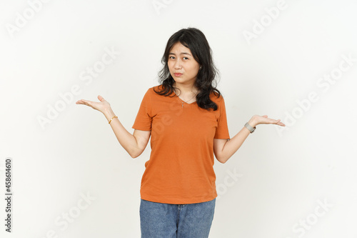 Showing Two product Copy Space on palm hand of beautiful asian woman Wearing orange T-shirt isolated on white background