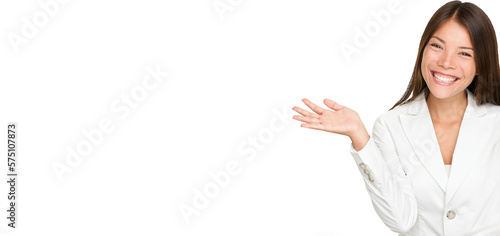 Showing Young Businesswoman open hand palm. Portrait of cheerful young businesswoman isolated white background. Mixed race Asian Caucasian female model in her 20s. Suit isolated in transparent PNG.