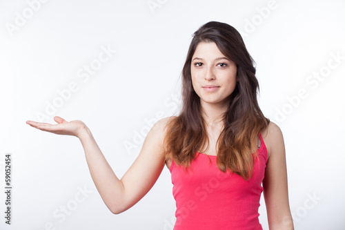Showing young woman, isolated on white