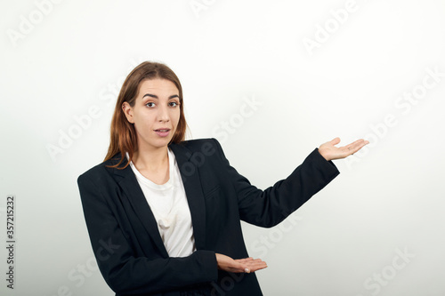 Shows direction of hands, demonstrates your product, represents an imaginary output, blank targeting, folded arm bent arrow. young attractive woman with brown hair in a light t-shirt, black jacket