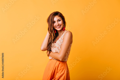 Shy european woman in yellow clothes posing in studio with sincere smile. Spectacular red-haired female model expressing happiness.